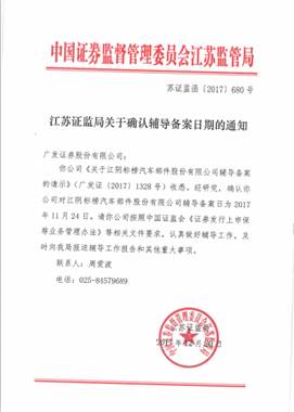公司已收到江蘇證監(jiān)局關(guān)于確認(rèn)輔導(dǎo)備案日期的通知,公司將會按照中國證監(jiān)會《證券發(fā)行上市保薦業(yè)務(wù)管理辦法》等相關(guān)文件要求,認(rèn)真做好輔導(dǎo)工作,及時(shí)向江蘇證監(jiān)局報(bào)送輔導(dǎo)工作報(bào)告和其他重大事項(xiàng)。