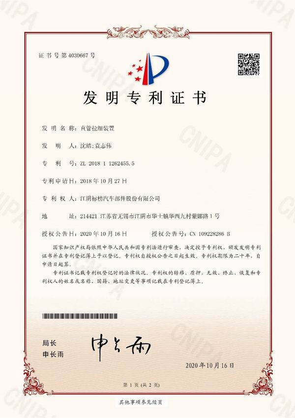公司研發(fā)的“直管拉細裝置”喜獲國家發(fā)明專利。